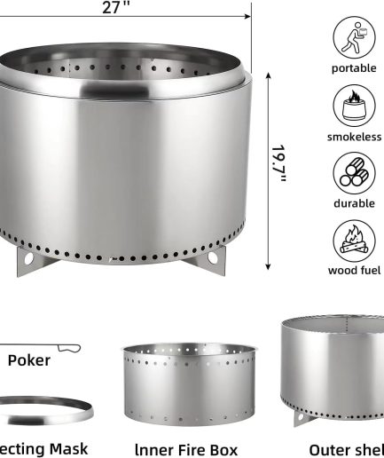 27″ Smokeless Fire Pit with Air Switch, Portable Stainless Steel Outdoor Firepit with Removable Stand & Stove Hook, Ash Pan, Wood Burning Firepit for Camping Backyard Patio Picnic